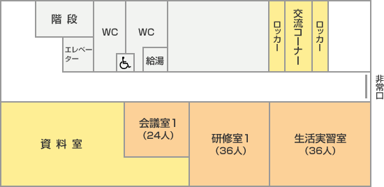 - 防音機能はないので、音漏れをする可能性があります。参加者の多い行事や音の出る活動の場合は、事前に2階受付にてご相談ください。